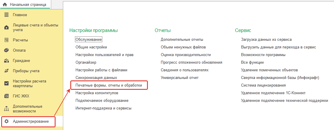 3. Зайти в меню «Администрирование» - «Печатные формы, отчеты и обработки» - «Расширения».