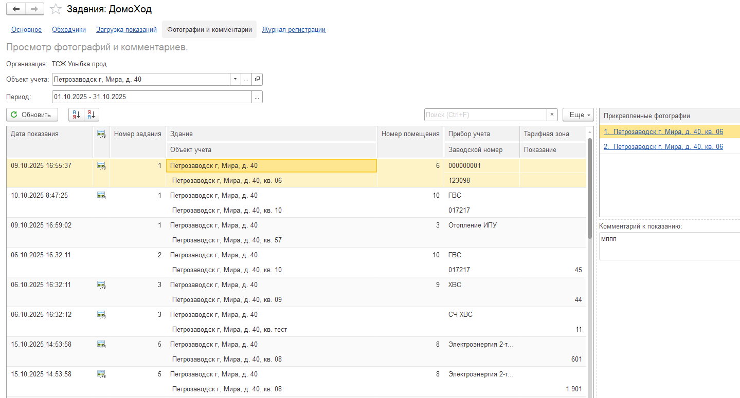 10. Если после загрузки показаний вы захотите пересмотреть фотографии счетчиков, которые были сделаны при обходе, вы сможете это сделать на вкладке «Фотографии и комментарии», указав здание (или помещение) и период: