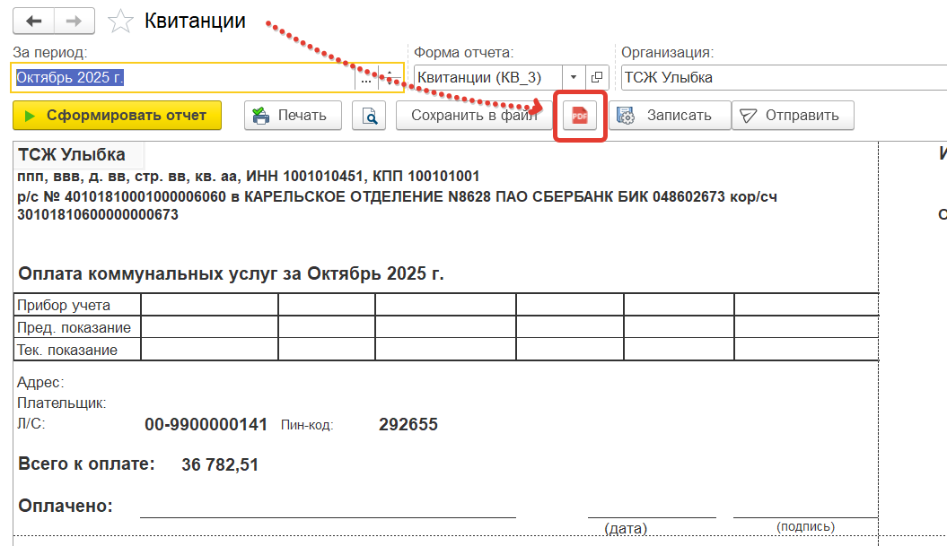 Сохранить квитанции или ЕПД в формате pdf можно с помощью соответствующей кнопки: