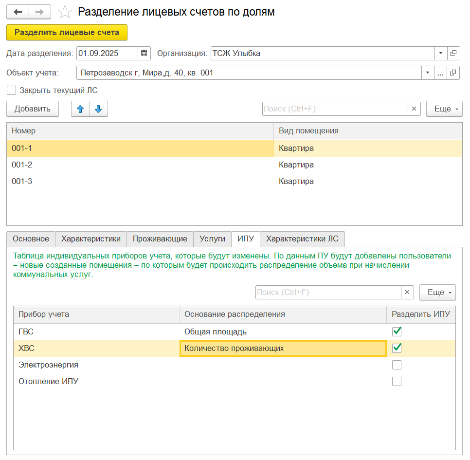 Изменился механизм разделения лицевых счетов по долям: на вкладке «ИПУ» теперь появилась возможность разделить индивидуальные приборы учета между указанными пользователями, по которым будет происходить распределение объемов при начислении.