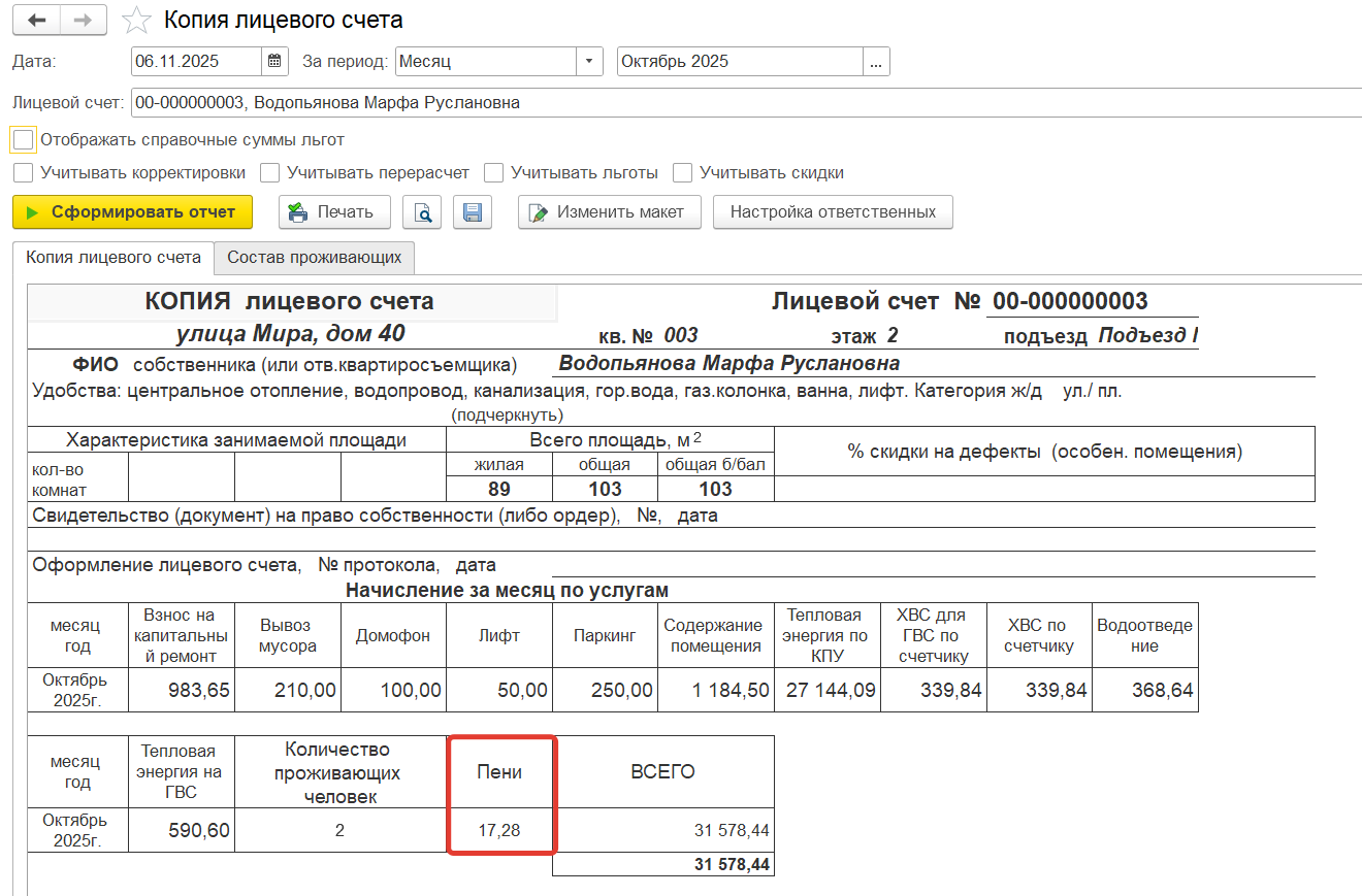 В печатную форму отчета «Копия лицевого счета» добавлена колонка «Пени».