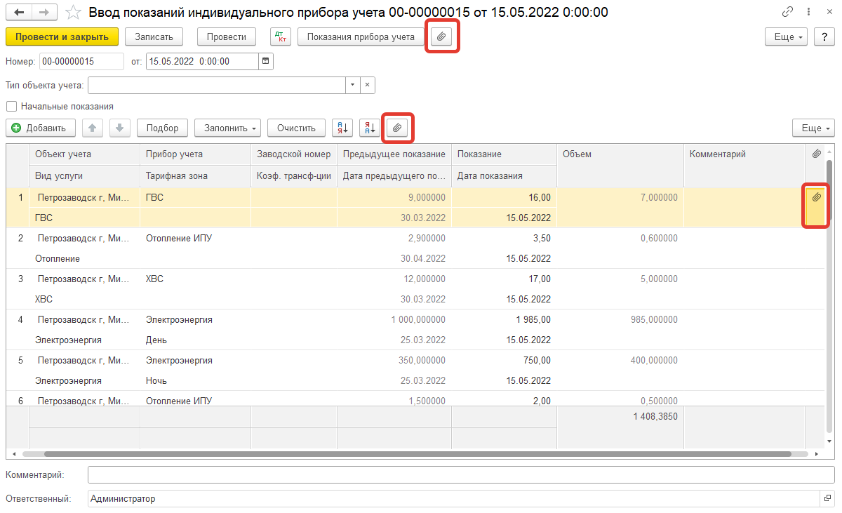 В справочниках «Индивидуальные приборы учета» и «Коллективные приборы учета» предусмотрено прикрепление общих файлов к прибору учета. В табличной части показаний кнопка доступна для просмотра прикрепленных файлов из документов «Ввод начальных показаний», «Ввод показаний индивидуальных приборов учета» и «Групповой ввод коллективных приборов учета».