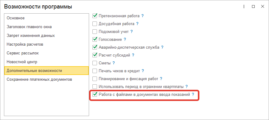 Для этого в меню «Администрирование» – «Возможности программы» необходимо установить флаг «Работа с файлами в документах ввода показаний».