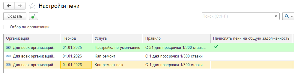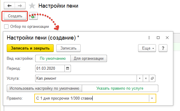 В открывшейся форме необходимо указать период настройки, услугу капитального ремонта и правило: с 1 дня просрочки 1/300 ставки.