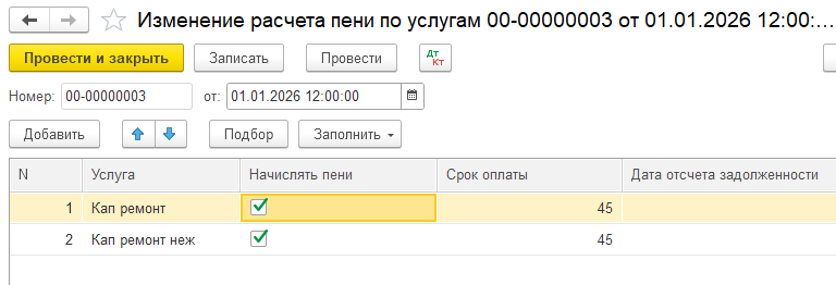 2. После выбора правила необходимо создать документ «Изменение расчета пени» с нужной даты. В документе указать услуги по капитальному ремонту, установить флаг «Начислять пени» и срок оплаты. Срок высчитывается следующим образом: со дня, следующего за указанным в этой колонке, начнется начисление пени. Если необходимо начислять пени с 31го дня просрочки, в этом документе указать 30. Если к этому сроку прибавляется еще какое-то количество дней, то указать сразу общий срок. Например, дается 15 дней на оплату задолженности - пени будут начисляться с 46го дня просрочки, срок оплаты указываем 45.