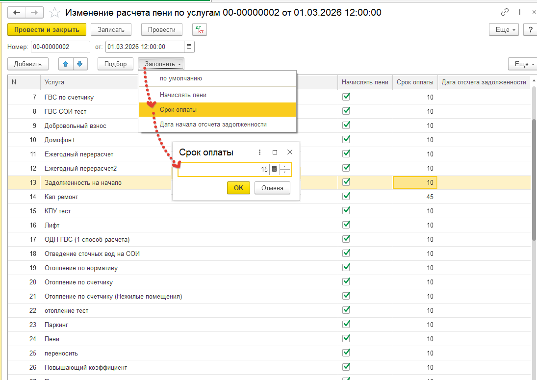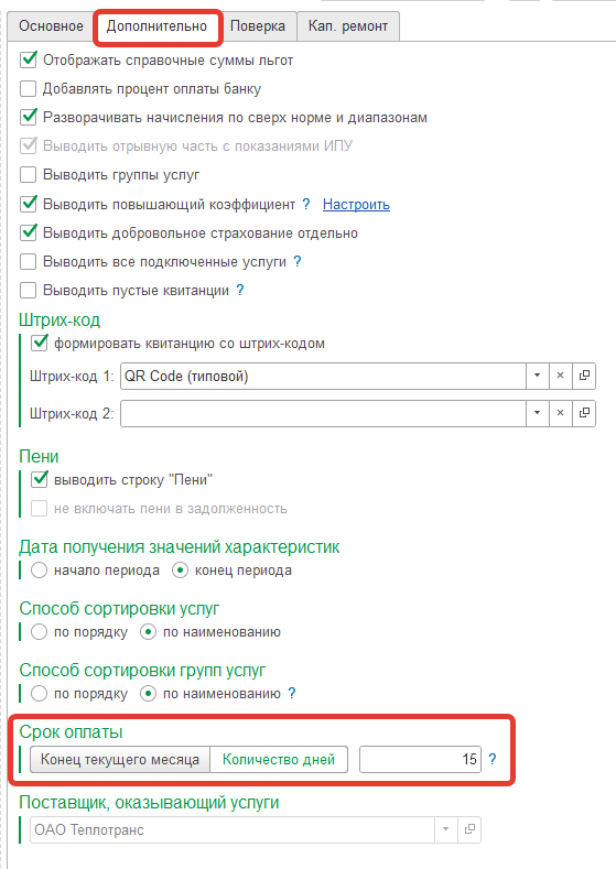 Если для капитального ремонта указана отдельная настройка, то для услуг капитального ремонта срок оплаты необходимо указать 45 дней.