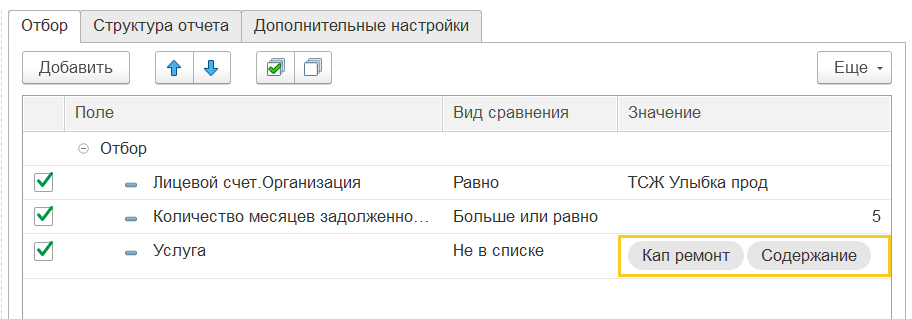 В отчете возможно устанавливать отборы, в том числе по количеству месяцев задолженности, по общей сумме задолженности. Для добавления отбора необходимо нажать кнопку «Показать настройки», затем в отборе добавить нужные вам отборы.