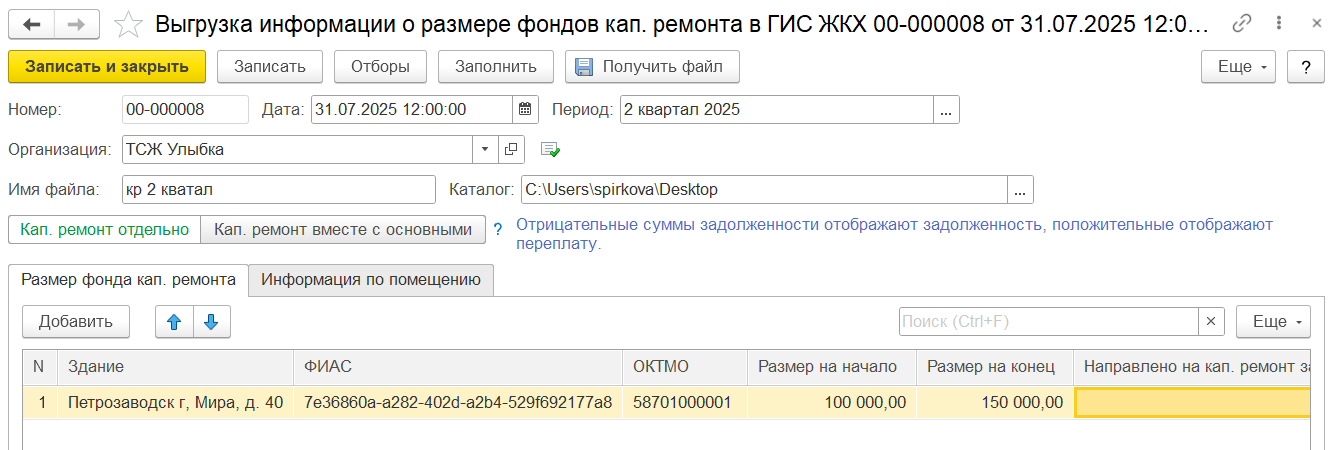Колонки «Размер на начало», «Размер на конец», «Направлено на кап. ремонт за период», «Задолженность за вып. работы на конец» необходимо заполнить вручную.