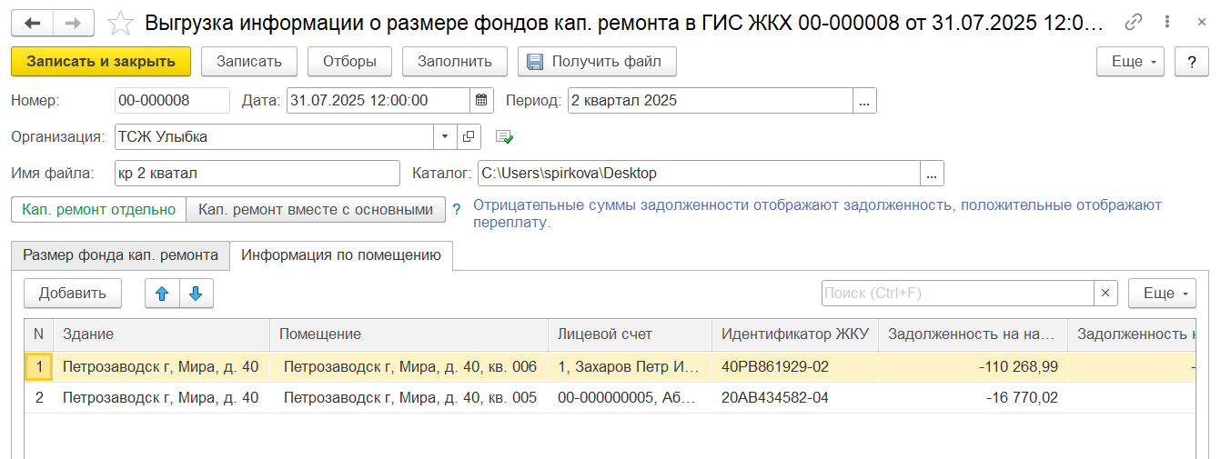 если указана настройка «Кап. ремонт вместе с основными»: в таблицу попадает информация по лицевым счетам с заполненной характеристикой «Идентификатор ЖКУ».