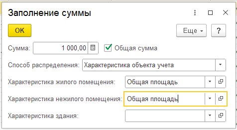 При установке флага «Общая сумма» можно распределить сумму по лицевым счетам равномерно (указав в способе распределения «Лицевой счет») или в зависимости от характеристик объекта учета. Пример:
