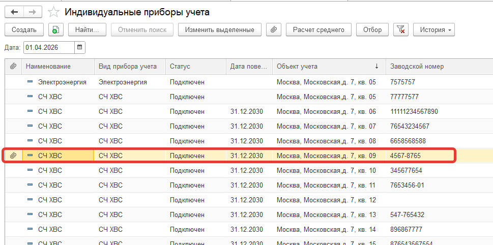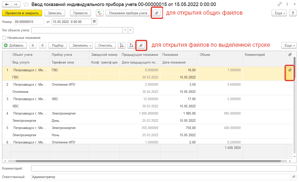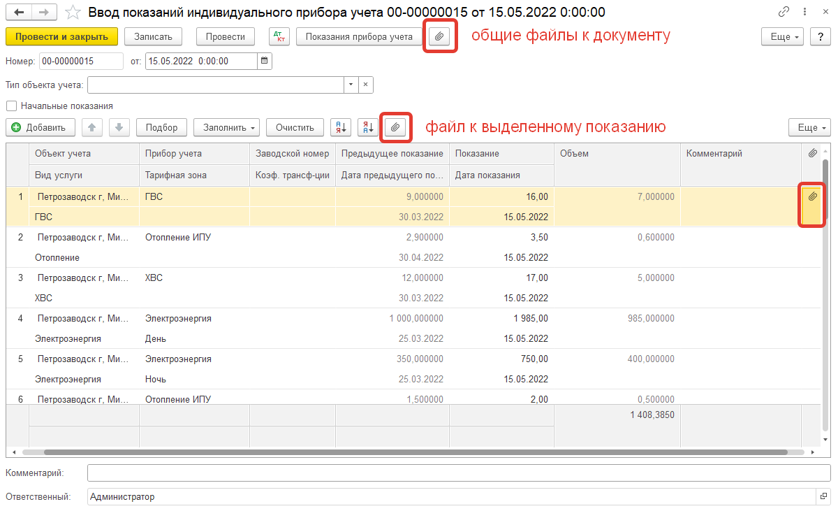 В списке документов ввода показаний и в справочнике приборов учета элементы с файлами обозначаются знаком «скрепки»: