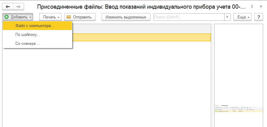 В программе есть возможность работать с файлами в документах ввода показаний приборов учета («Ввод начальных показаний», «Ввод показаний индивидуального прибора учета», «Групповой ввод показаний коллективного прибора учета» и «Ввод показаний коллективного прибора учета»), а также в справочниках «Индивидуальные приборы учета» и «Коллективные приборы учета».