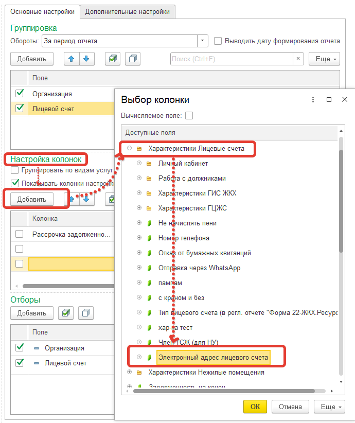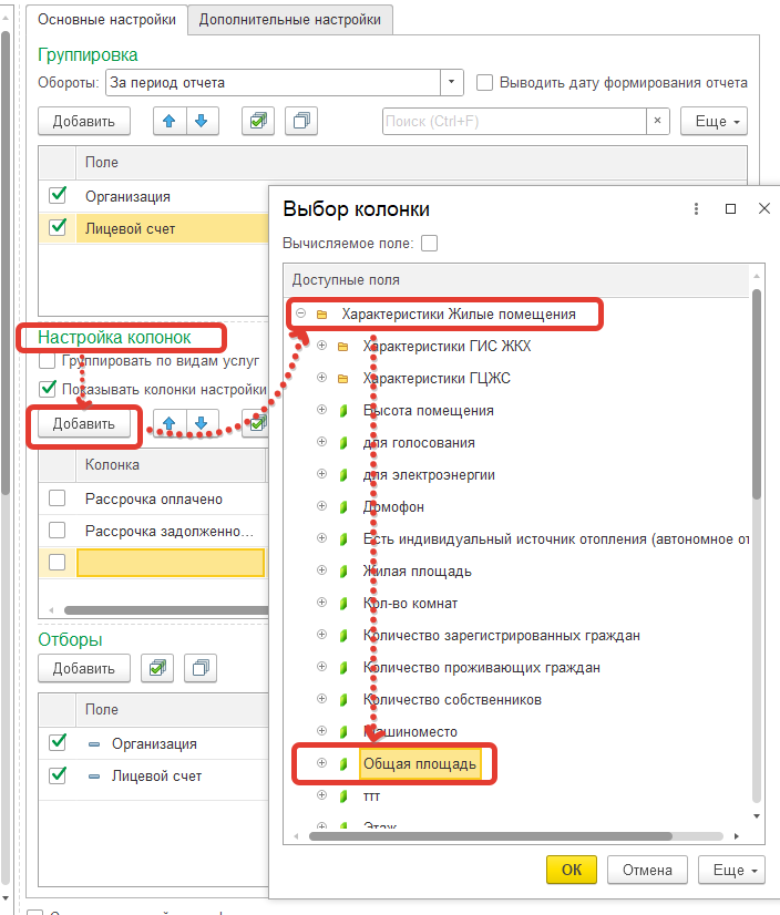 Так же в отчет можно добавлять колонки с характеристиками помещений и лицевых счетов: